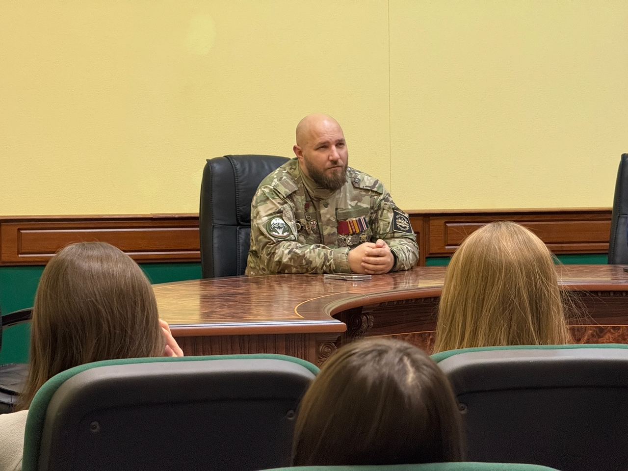 Особой частью мероприятия стало выступление участника специальной военной операции Ивана Сергеевича Плотникова. Он рассказал о своём пути: о том, как отправился защищать страну по зову сердца, о службе в разведке и постоянной работе на линии боевого соприкосновения. Иван Сергеевич поделился воспоминаниями о боевых товарищах, совершавших героические поступки в самых сложных условиях. Он откровенно рассказал о тяжёлых ранениях, о преодолении последствий и о том, как опыт боевой службы меняет человека.