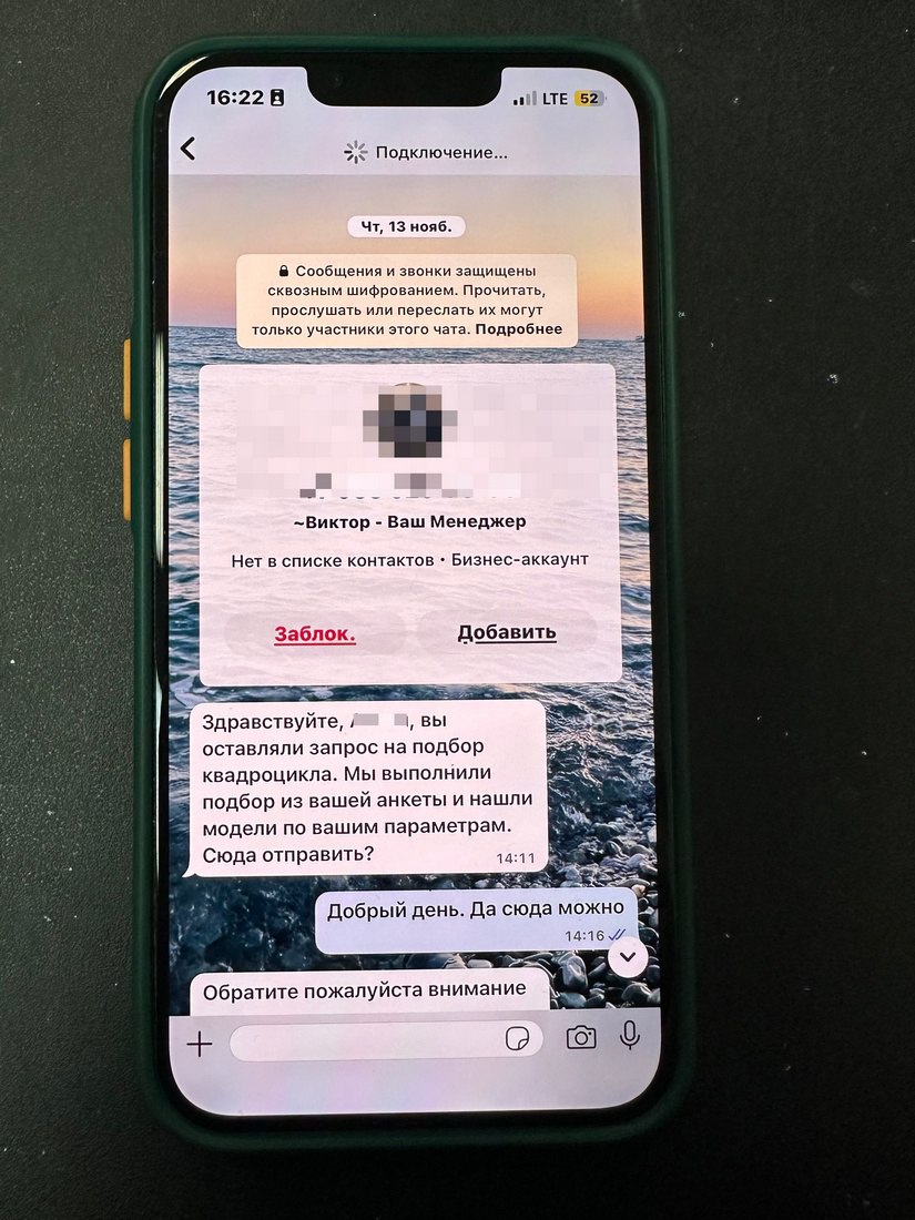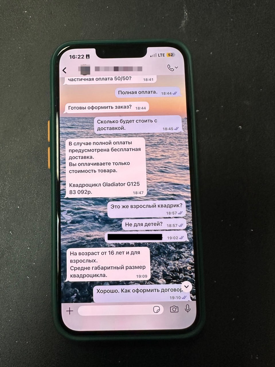 Мужчина рассказал полицейским, что хотел купить квадроцикл. Заявитель нашёл специализированный интернет-магазин и оставил свои контактные данные. Спустя время в популярном мессенджере югорчанину написал неизвестный, который представился менеджером. В переписке, договорившись о покупке, мошенник отправил заявителю договор на приобретение квадроцикла и попросил оплатить стоимость товара, переведя деньги на расчётный счёт по реквизитам организации. Заявитель не усомнился в честности сделки. Злоумышленник заверил, что транспортное средство отправлено по адресу доставки. В указанные менеджером дни товар не пришёл, мошенник перестал выходить на связь с югорчанином, а сайт оказался фишинговым.