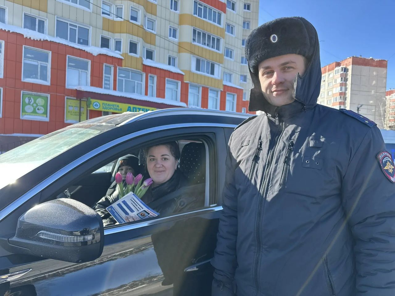 В преддверии 8 Марта на дорогах округа — самая приятная «проверка документов». По доброй традиции автоинспекторы сменили жезлы на букеты и вышли поздравлять прекрасных дам.