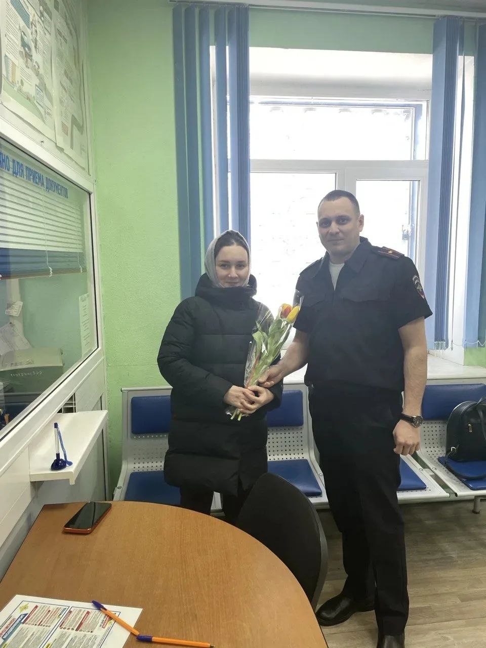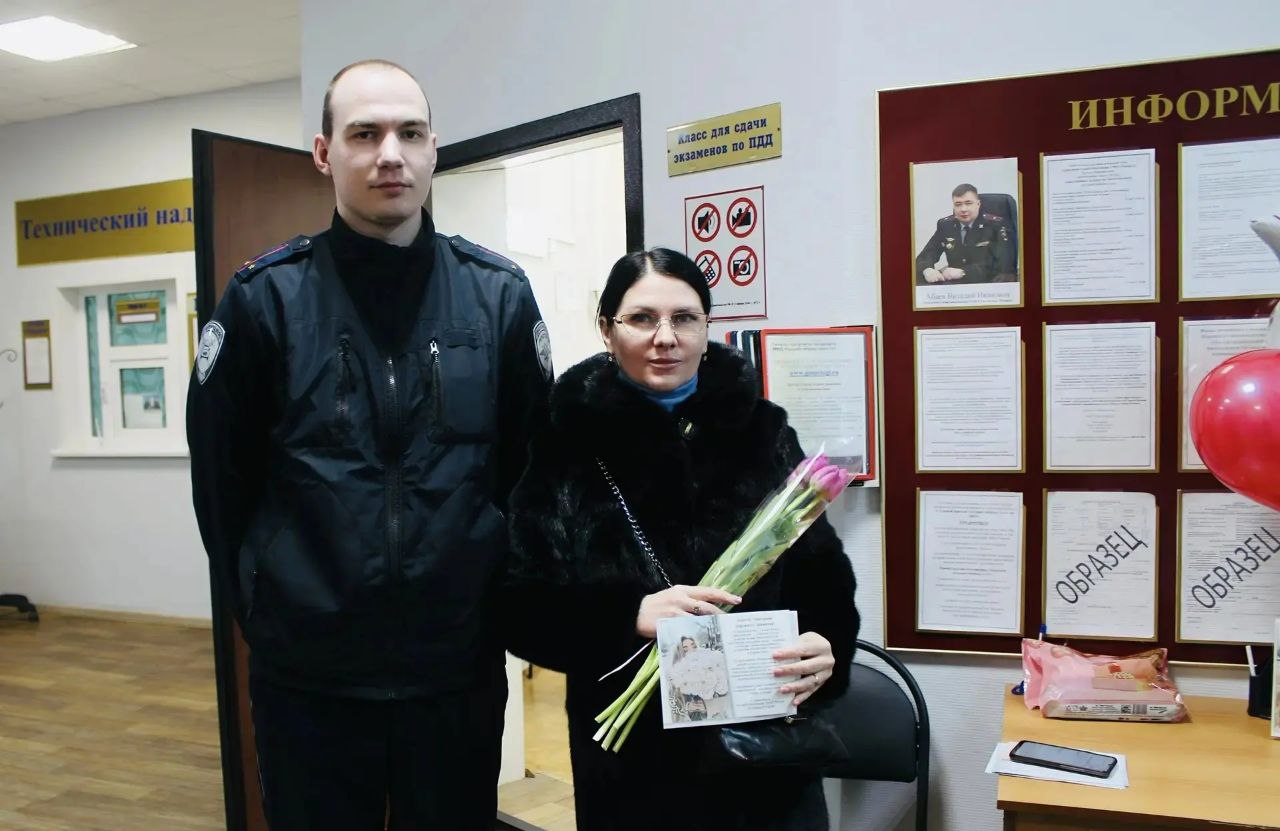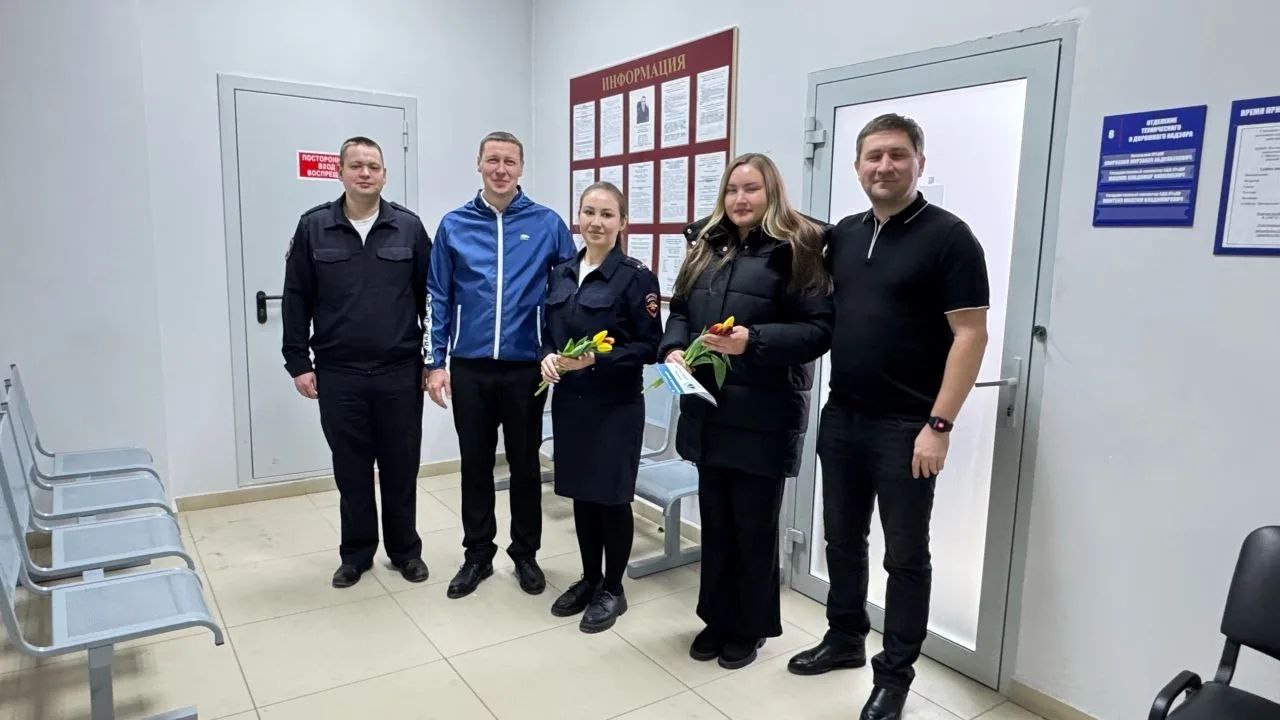 В окружной столице и других муниципалитетах инспекторы вручают весенние букеты и открытки тем, кто обратился за получением водительских удостоверений или регистрацией транспорта.