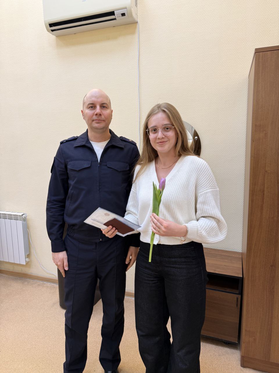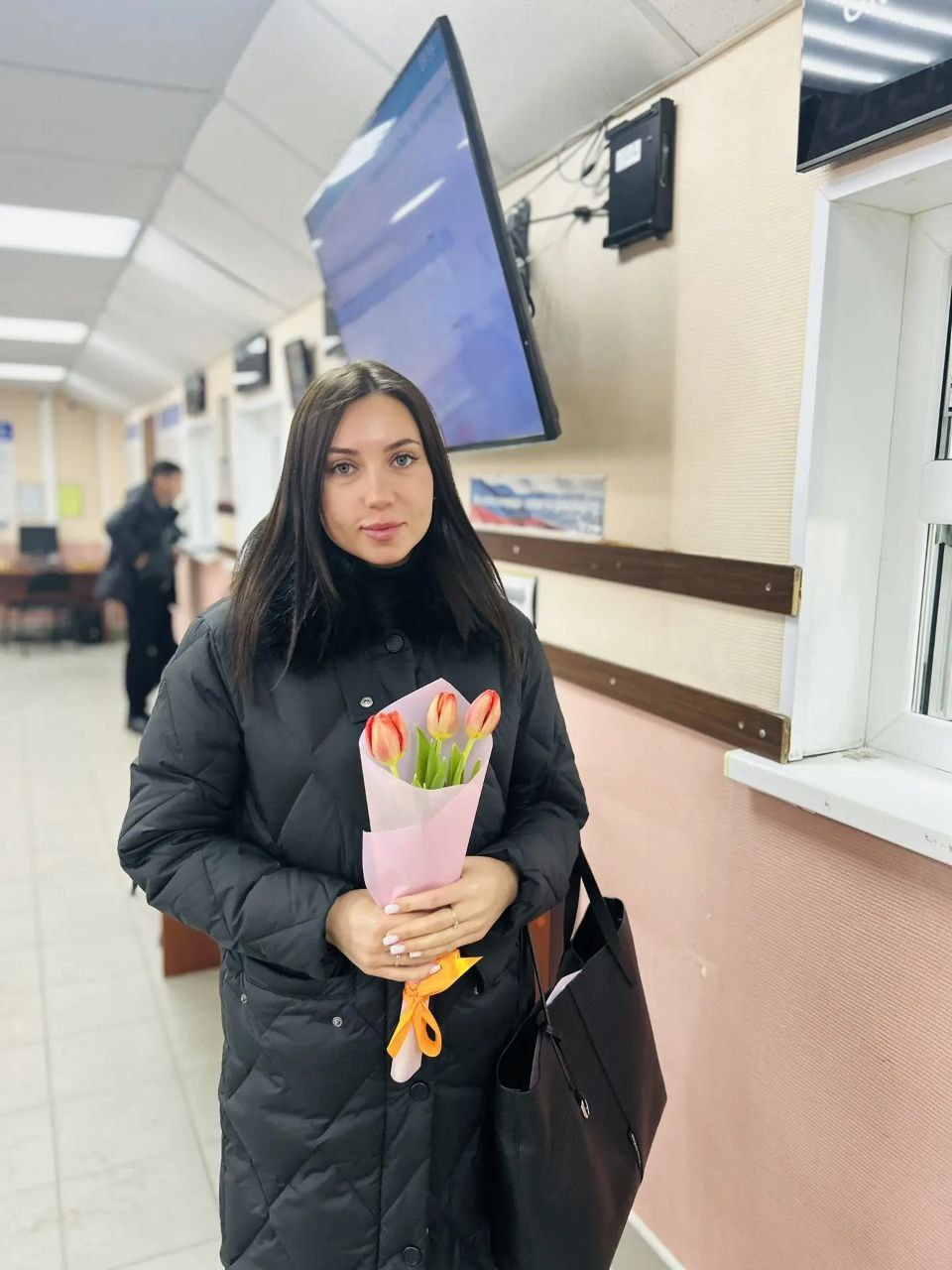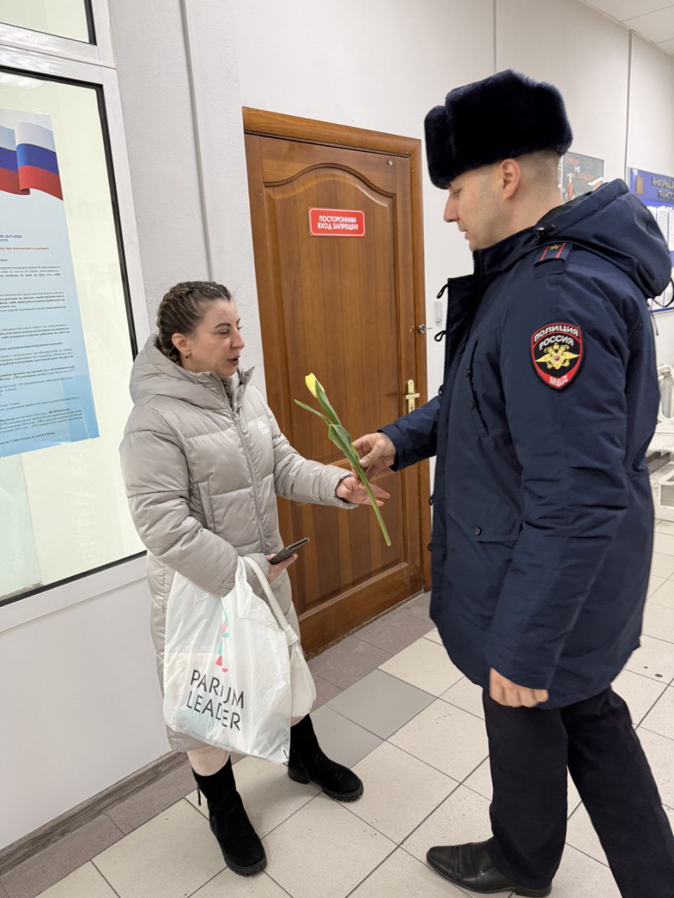 В окружной столице и других муниципалитетах инспекторы вручают весенние букеты и открытки тем, кто обратился за получением водительских удостоверений или регистрацией транспорта.