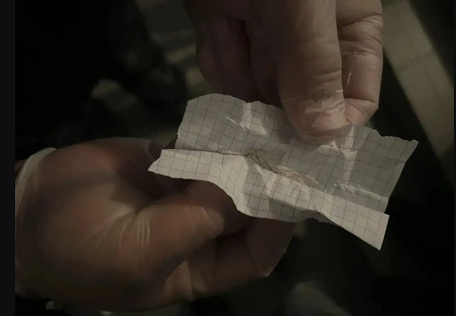 У задержанного в ходе личного досмотра был изъят полимерный свёрток. В нём находился бумажный свёрток с порошкообразным веществом светлого цвета.