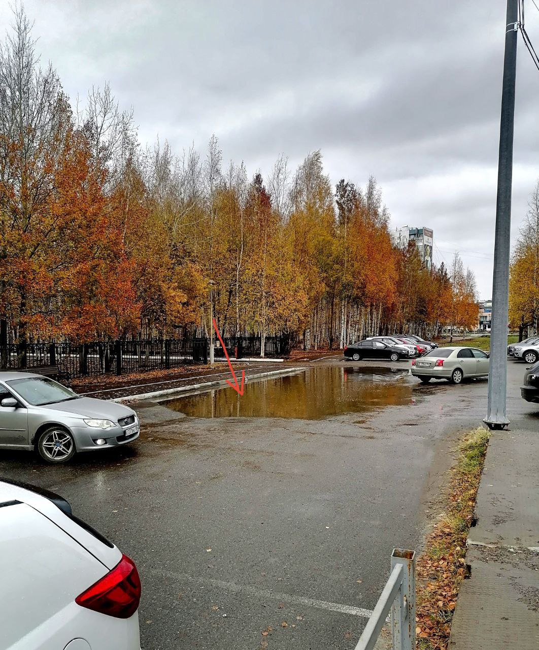 Было сливное отверстие, так как в этом месте низина. Дорожники отверстие заделали и теперь в этом месте постоянно огромная глубокая лужа. Резко сократилось количество парковочных мест и неудобство посадки /высадки детей на занятия в школу. Просьба к администрации города восстановить слив!