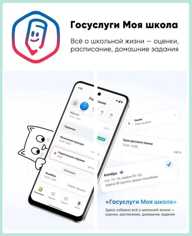 «Госуслуги Моя школа» – мобильное приложение для школьников и их родителей, которое позволяет упростить учебный процесс и сделать его более удобным. Здесь вы узнаете распорядок дня ребёнка, расписание уроков, домашние задания или занятия с репетитором. Все сведения защищены и доступны только родителю и ребёнку.