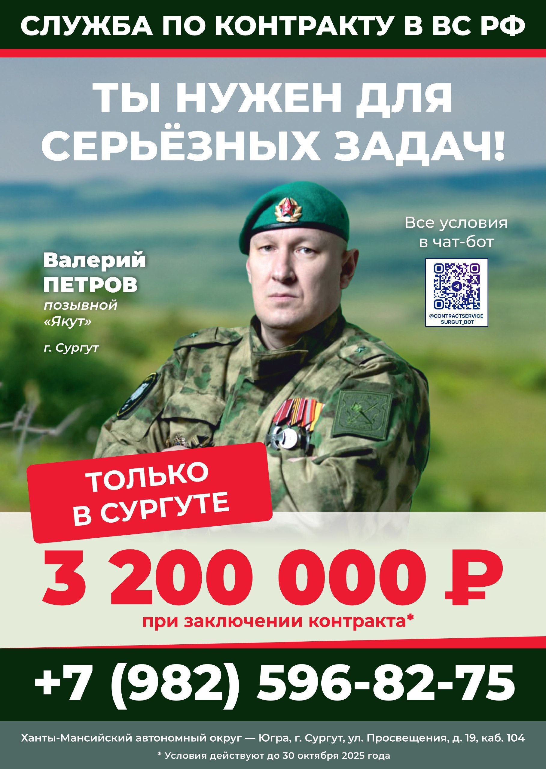 3 200 000 рублей можно получить в Сургуте при заключении контракта на военную службу до 30 октября 2025 года. Это самая высокая выплата в стране!