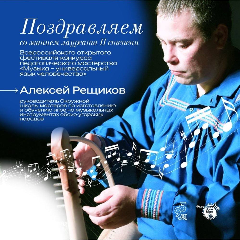 Алексей Рещиков из Окружного дома народного творчества стал лауреатом II степени Всероссийского фестиваля-конкурса «Музыка – универсальный язык человечества». Он победил в номинации «Национальное творчество народов России», представив нотные сборники и методическое пособие по обучению игре на традиционных инструментах обско-угорских народов.