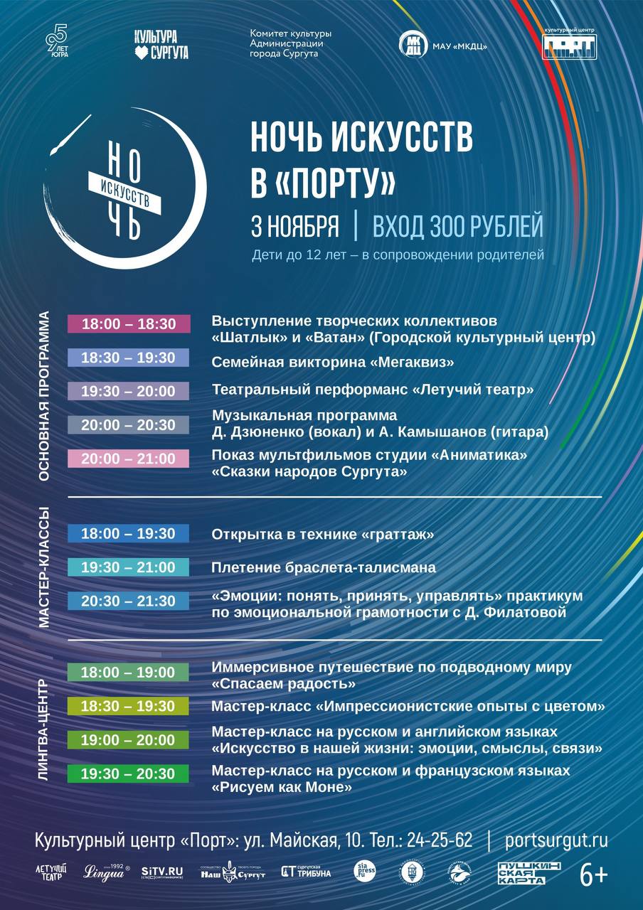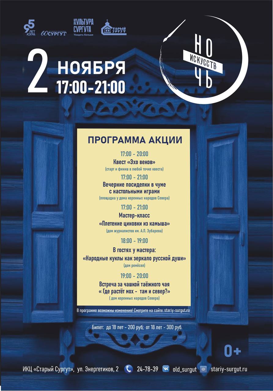 В рамках акции пройдёт череда тематических мероприятий для сургутян и гостей города. Мы собрали для вас самые интересные – выбирайте и готовьтесь к незабываемой «Ночи искусств»!