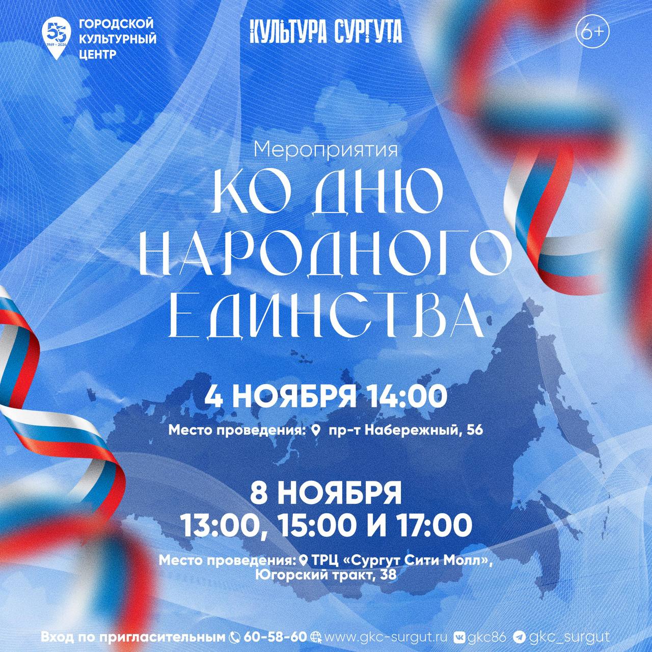 4 ноября Городской культурный центр приглашает сургутян отпраздновать День народного единства. В 14.00 состоится тематический концерт в рамках проекта «Сургут – наш общий дом» ко Дню народного единства.