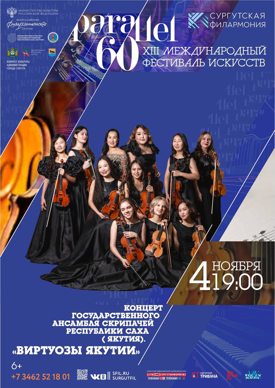 4 ноября в 19.00 Сургутская филармония приглашает на концерт Государственного ансамбля скрипачей Республики Саха (Якутия) «Виртуозы Якутии» в рамках XIII Международного фестиваля искусств «60 параллель».
