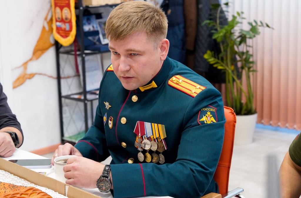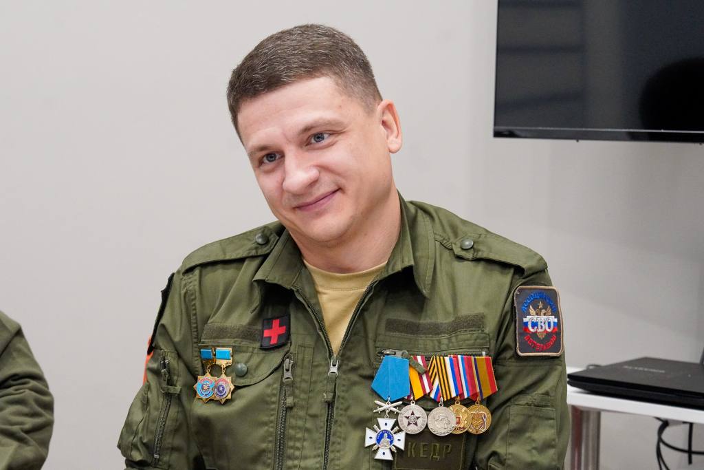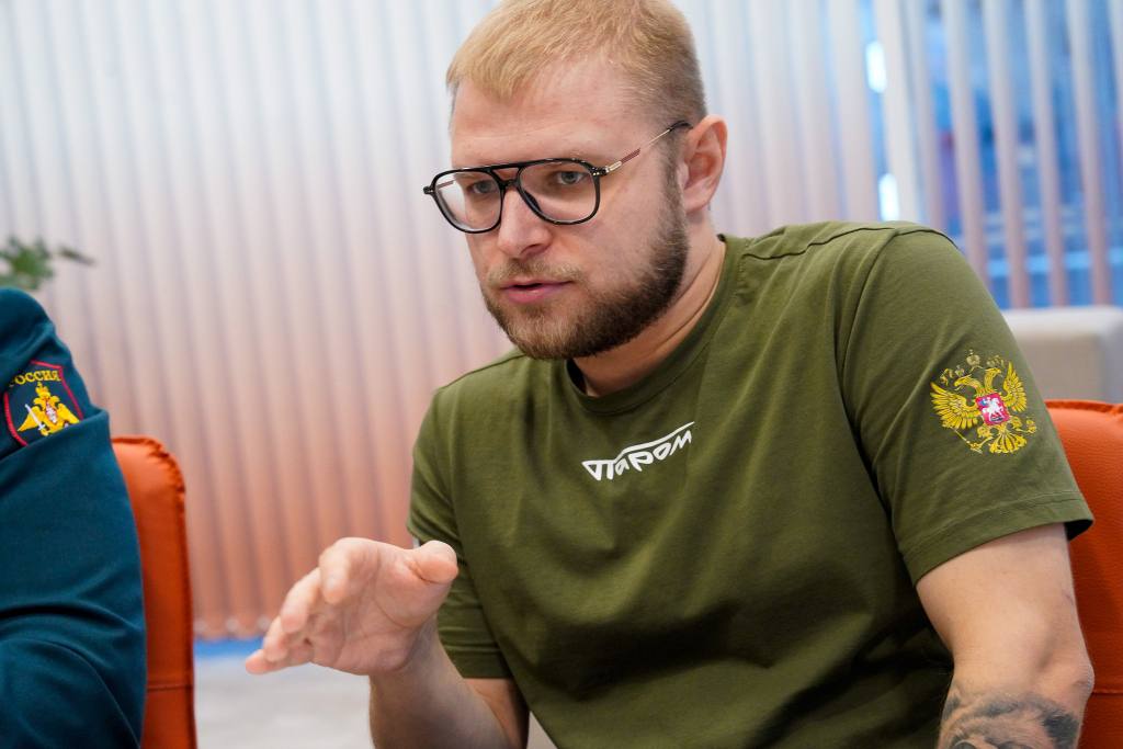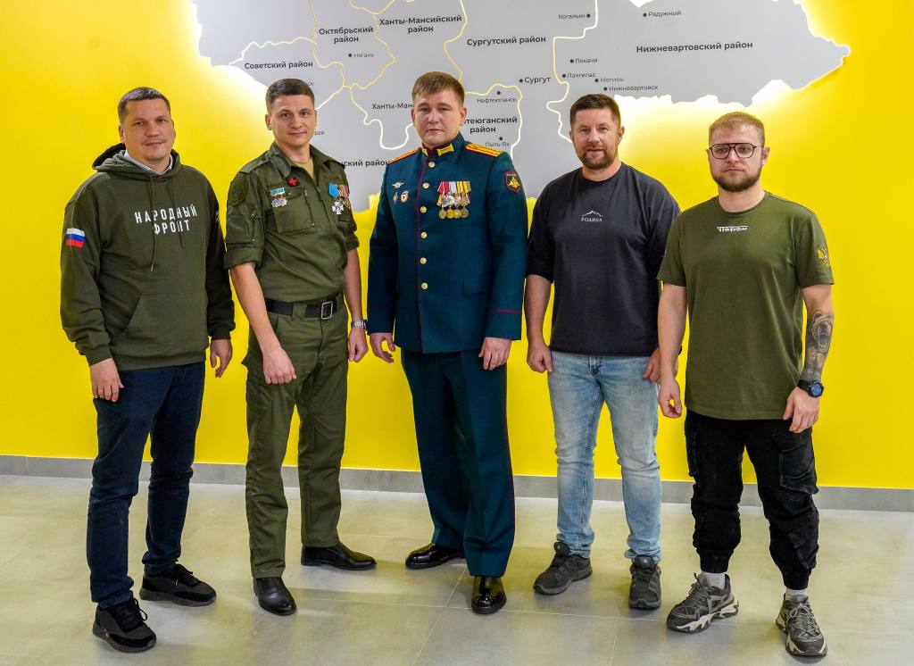 За столом в окружном филиале государственного фонда «Защитники Отечества» собрались журналисты, герои СВО — участники программы «Время героев» Павел Русин и «Герои Югры» Константин Жучков, руководитель филиала фонда Игорь Илык и рэпер Паром.