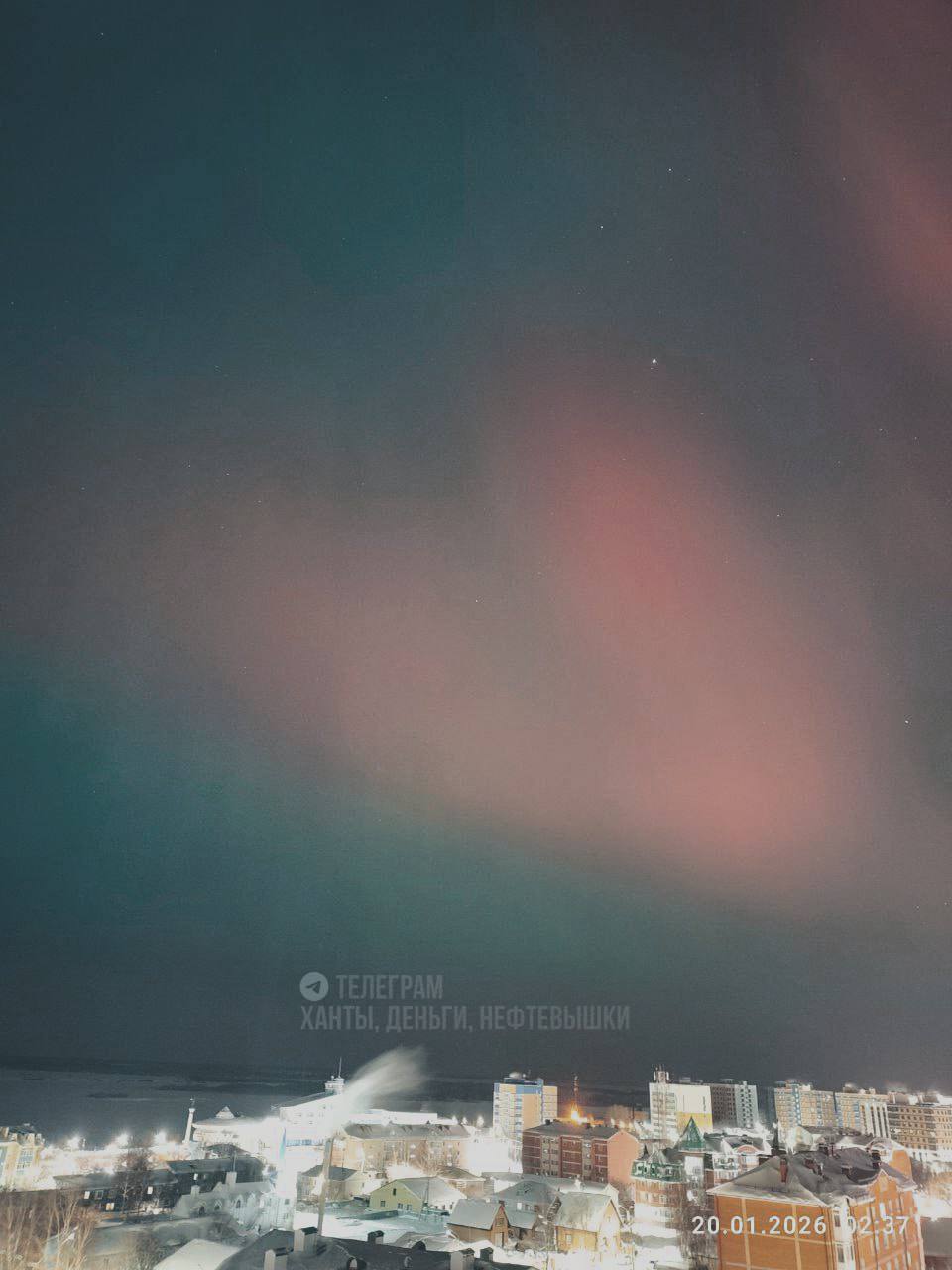Ночное небо над Ханты-Мансийском украсило северное сияние. Этим зрелищем сегодня поделились наши подписчики. Из-за высокой солнечной активности, достигшей семи баллов, в небе появилось яркое и завораживающее световое шоу.