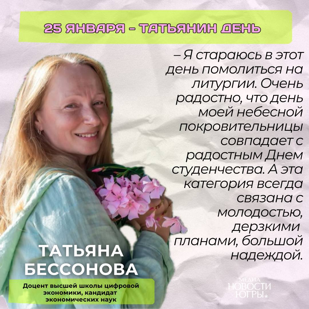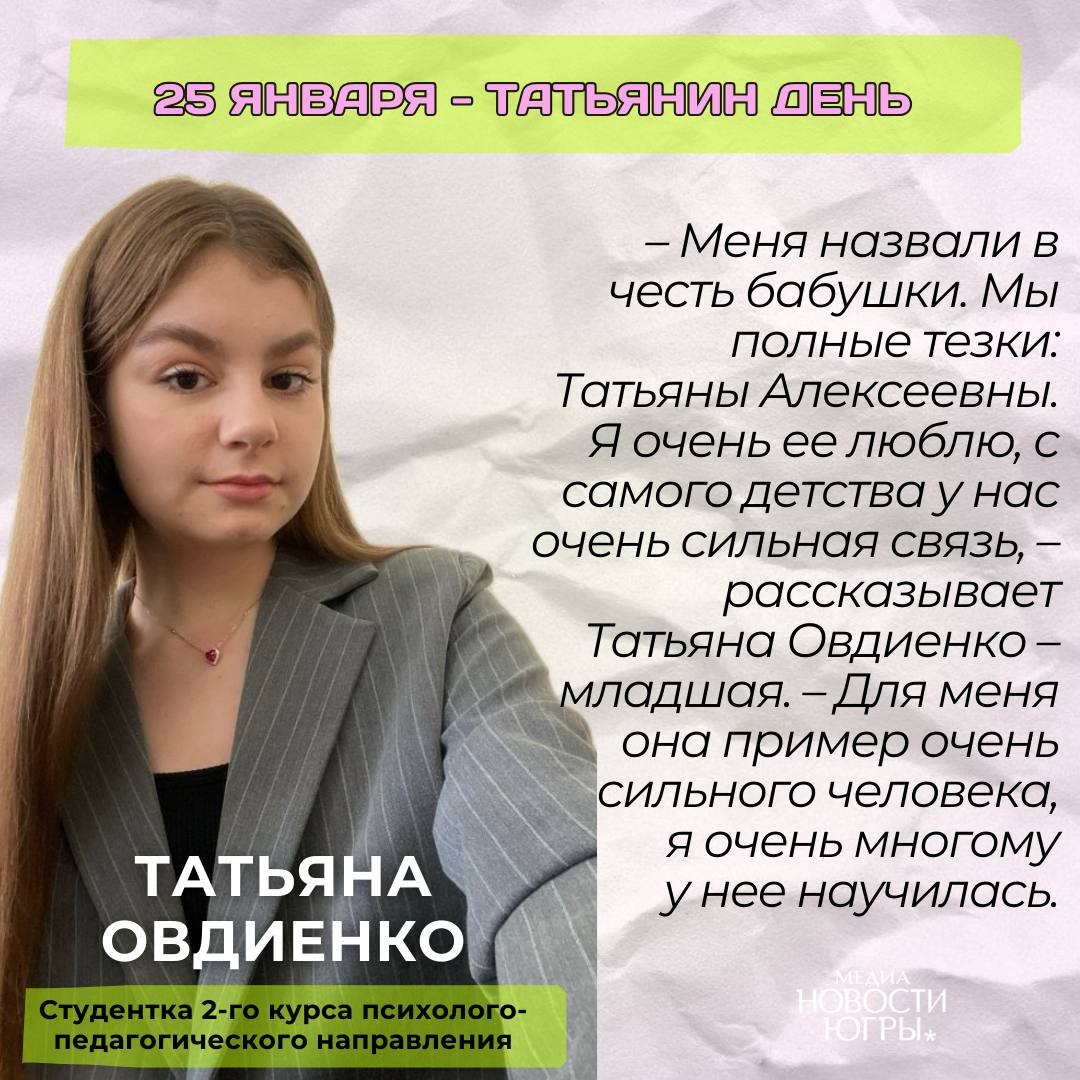 Накануне Дня студента – Татьяниного дня мы отыскали в Югорском госуниверситете несколько замечательных Татьян. С Татьяной Иващенко, Татьяной Ладыженской, Татьяной Бессоновой и Татьяной Овдиенко мы поговорили о празднике, их работе и учебе, а также об имянаречении.