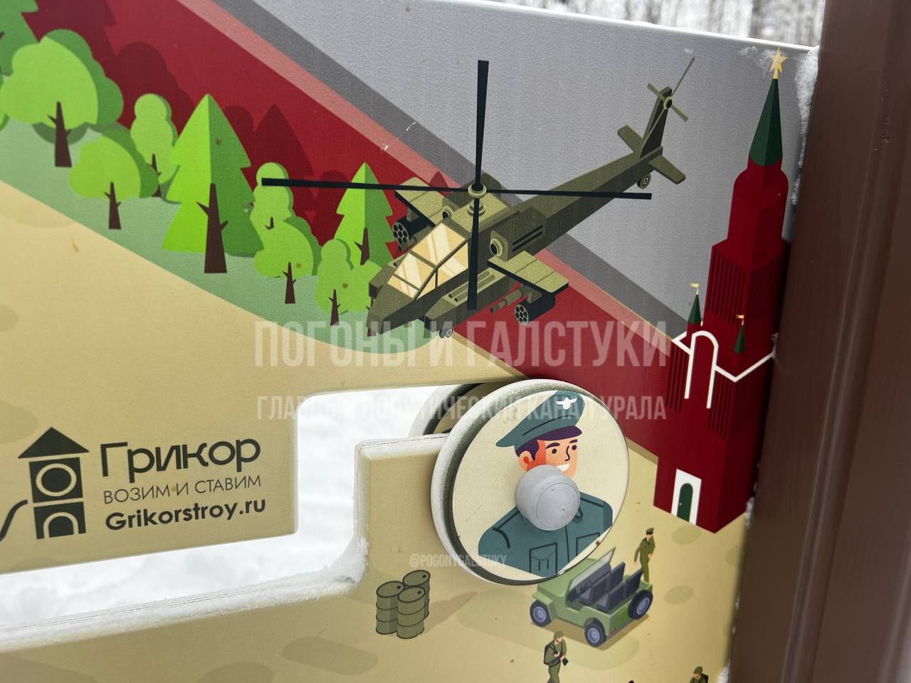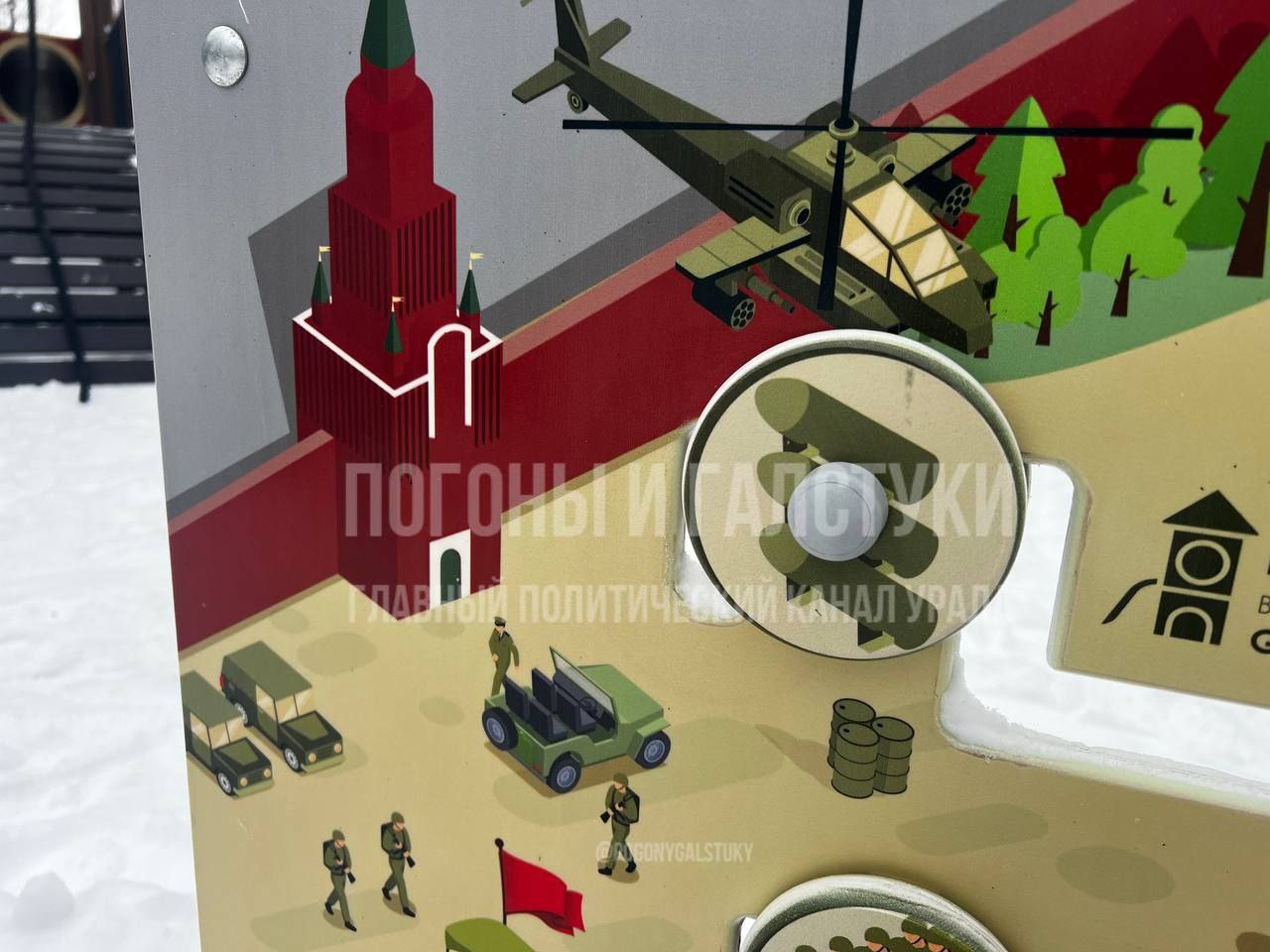 Необычную конструкцию стоимостью почти 150 миллионов рублей установили, что особенно символично, в городском Парке Победы. Вместо традиционных рисунков родителей и детей встретили бизиборды с солдатами НАТО возле Кремля, вертолётами Apache, автомобилями Hummer и собором Василия Блаженного без православного креста.