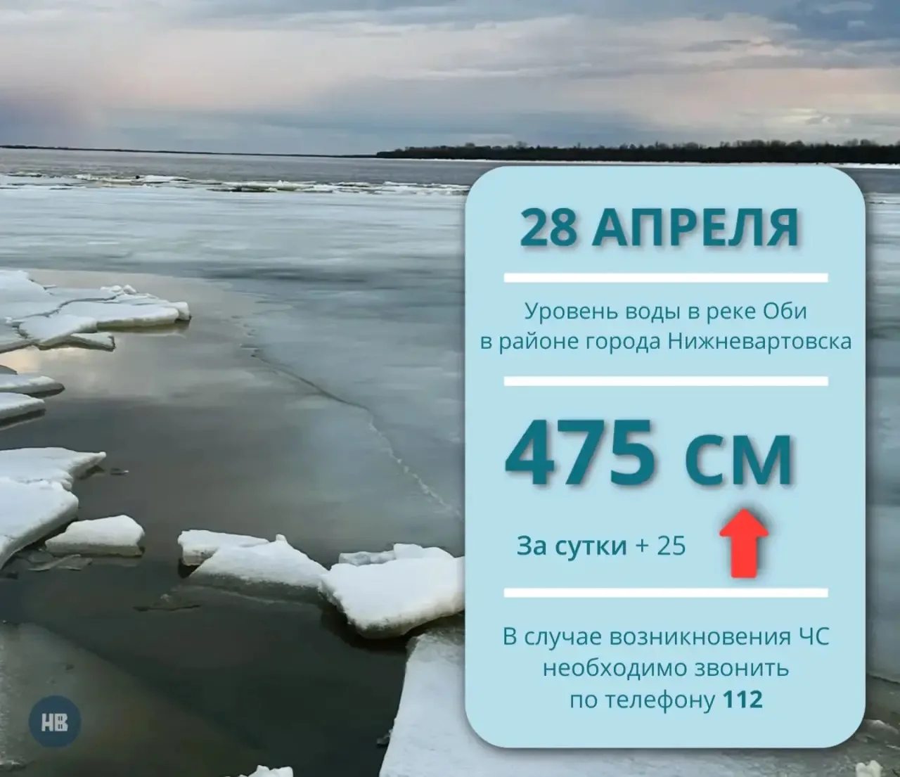 По информации Ханты-Мансийского центра по гидрометеорологии и мониторингу окружающей среды - филиала «Обь-Иртышское управление по гидрометеорологии и мониторингу окружающей среды», сегодня, 28 апреля, уровень воды в реке Оби составляет 475 сантиметров (плюс 25 сантиметров за минувшие сутки, подвижки льда, вода на льду).