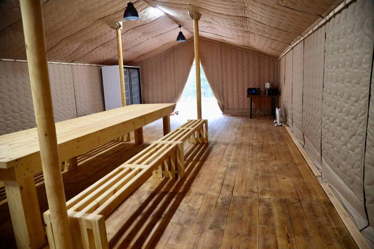 Новый объект гармонично вписывается в живописный лесной массив. Рабочие отсыпали территорию и установили модульные конструкции. На территории расположили контрольно-пропускной пункт, армейские палатки, зону отдыха с очагом, металлические контейнеры для хранения инвентаря и снаряжения
