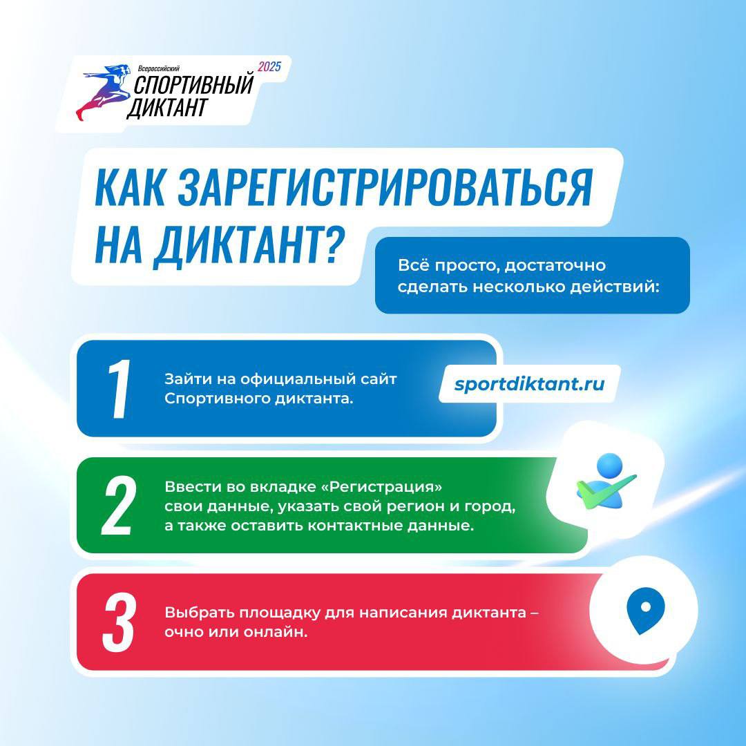 Время начала диктанта для очных участников единое по всей стране — 11:00 местного времени. Заочное участие можно пройти в любое удобное время в течение дня. Ориентировочная продолжительность диктанта – 1 час. В качестве основных площадок выбрали спортивные вузы, училища и школы олимпийского резерва, образовательные учреждения, культурные, научные и общественные центры. Инициатор акции — трёхкратная олимпийская чемпионка по синхронному плаванию Мария Киселёва.
