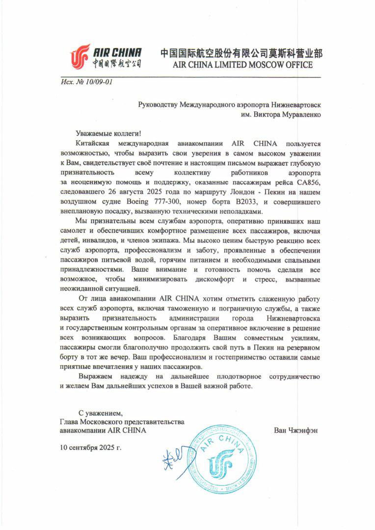 Благодарственное письмо за подписью главы московского представительства Air China Вана Чжэнфэна пришло в адрес аэропорта Нижневартовска им. Виктора Муравленко. Напомним, 26 августа 2025 года в международном аэропорту Нижневартовска произвел вынужденную посадку трансконтинентальный лайнер, следовавший по маршруту Лондон — Пекин.