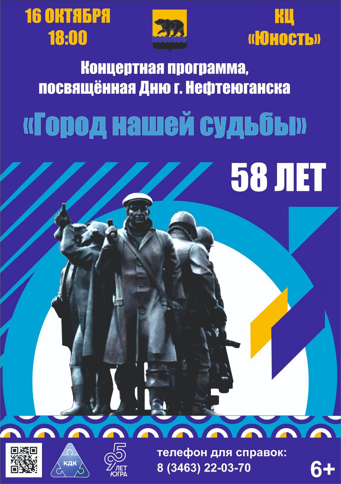 Приглашаем на концертную программу «Город нашей судьбы» в честь 58-й годовщины со дня образования города Нефтеюганска. Мероприятие состоится в Культурном центре «Юность» 16 октября 2025 года в 18.00.