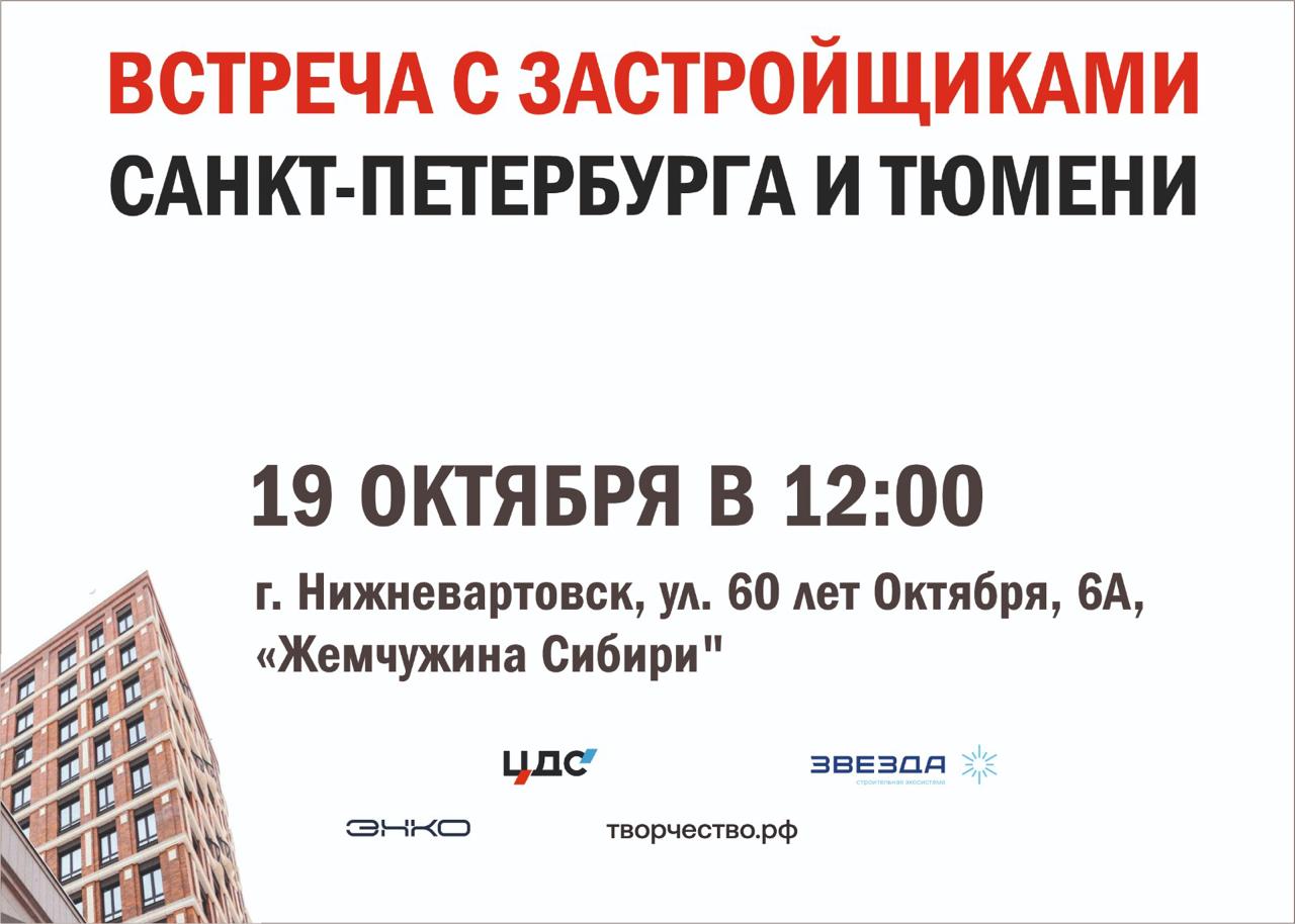 19 октября в 12:00 в Нижневартовске, по адресу: ул. 60 лет Октября, 6А, "Жемчужина Сибири", пройдет встреча с застройщиками Санкт-Петербурга и Тюмени, на которой жителям Нижневартовска расскажут о возможностях приобретения недвижимости в указанных городах и поделятся различными программами покупки жилья.