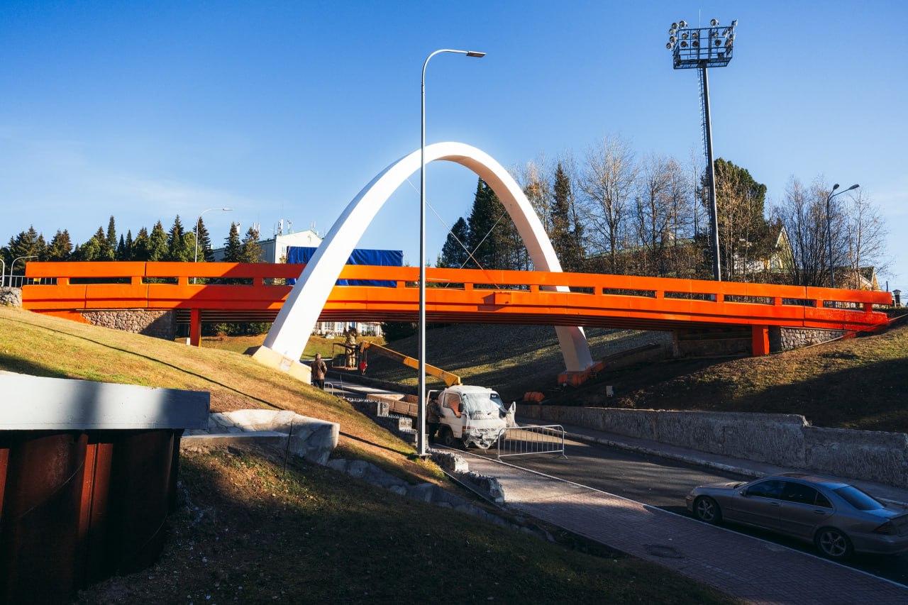 Напомним, продолжается масштабная реконструкция биатлонного центра. Там меняют тротуары и бордюры, а мост окрашивают в оранжевый цвет.