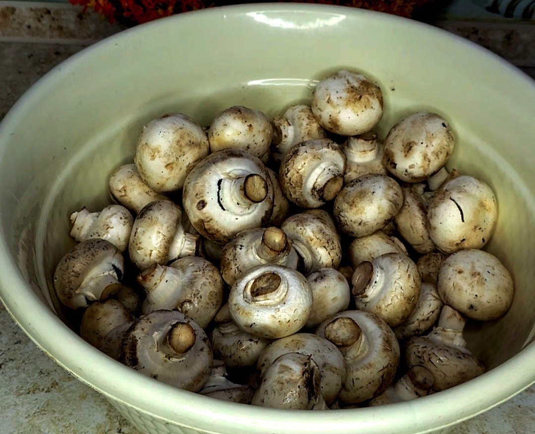 1. Начать следует с того, чтобы поместить шампиньоны в большой таз. Это даст возможность равномерно очистить все грибы за короткое время.