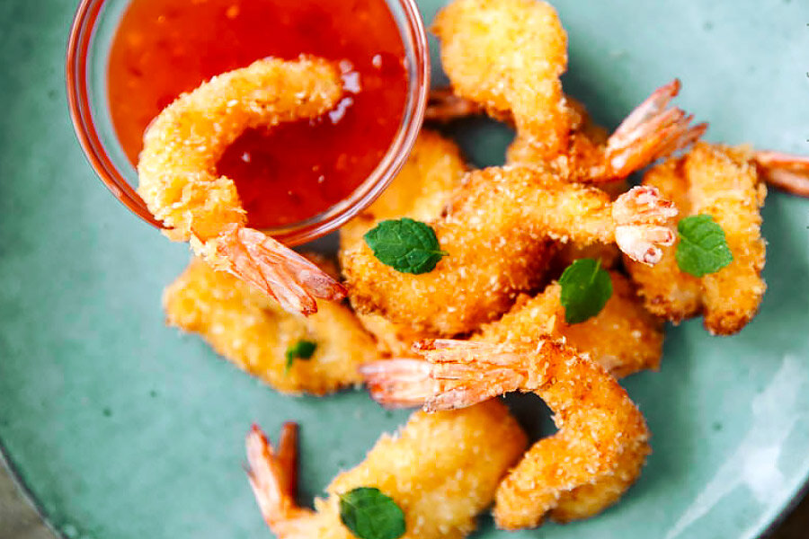 Теперь начинается самый ответственный этап: каждую креветку обваливают сначала в крахмале, затем в яичной смеси и в конце в панировочной смеси. Далее креветки аккуратно опускают в горячее масло, обжаривая порциями по 5-6 штук за раз до появления золотистой корочки, что займет всего 15-20 секунд. Готовые креветки выкладываются на металлическую решетку или бумажное полотенце для удаления лишнего масла. Подаются они лучше всего с сладким чили соусом или любимым соусом.