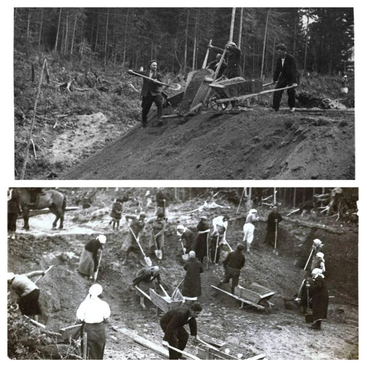 Строительство дороги шло четыре года. Уже в 1937 году она стала проезжей для лошадей, в 38 – для транспорта. Спустя 12 лет участок выложили булыжником – для работы также привлекали местных жителей: и мужчин, и женщин.