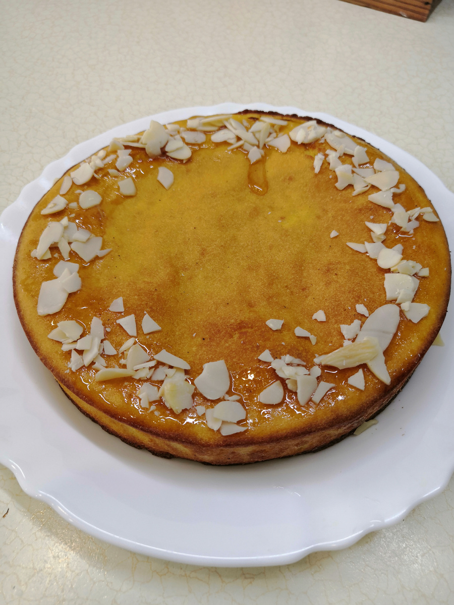 Выпекать в разогретой до 180 °C духовке около 30–40 минут, ориентируясь на свою технику. Для красивой корочки можно смазать края формы медом и посыпать миндальными лепестками.