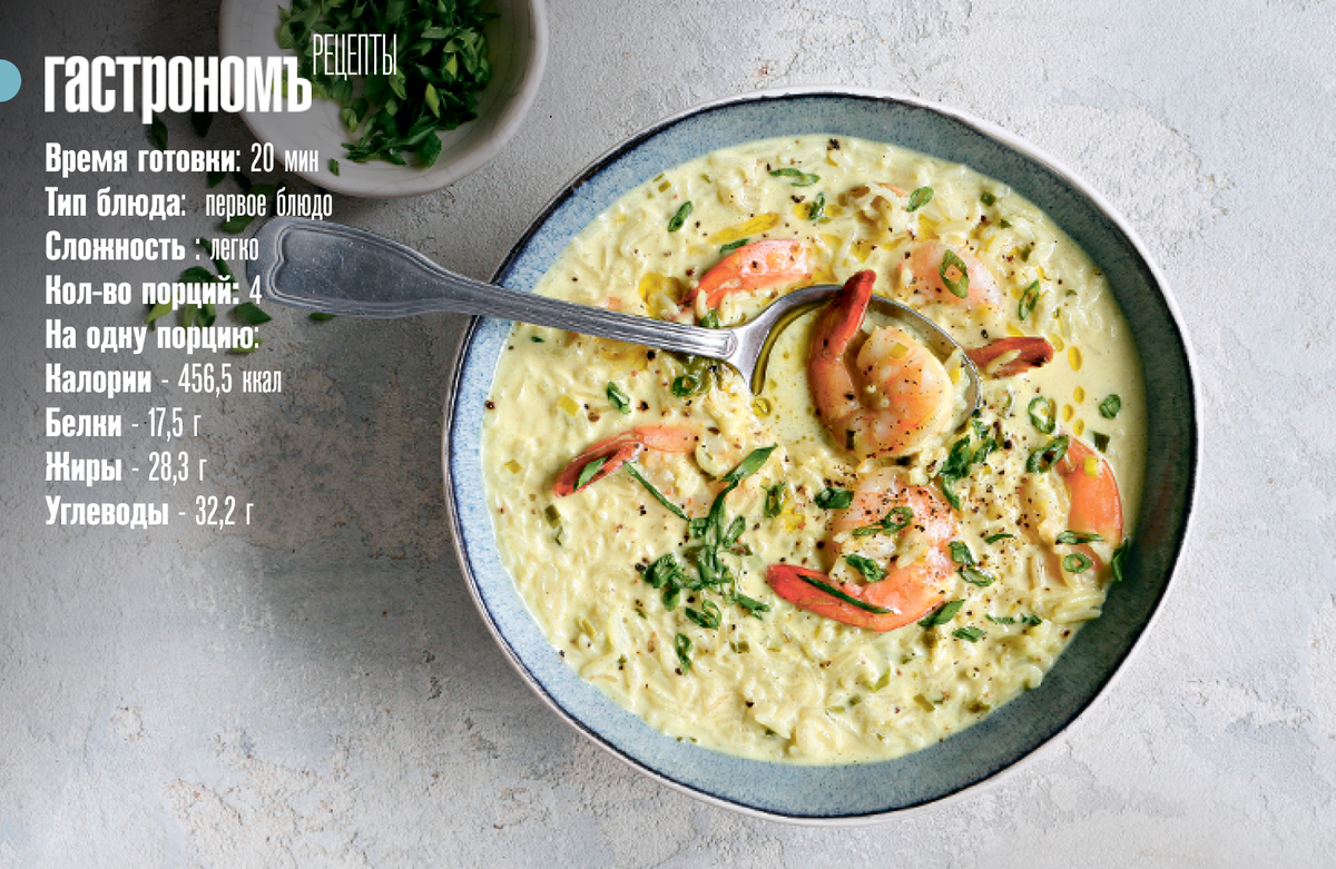 Шаг 2: В суп выложить размороженные креветки и продолжать готовить еще 6 минут. Когда рис будет готов, посолить суп и приправить свежемолотым перцем. Разлейте ароматный суп по тарелкам и украсьте оставшимися перьями зеленого лука. Для финального аккорда перед подачей можно сбрызнуть оливковым маслом.