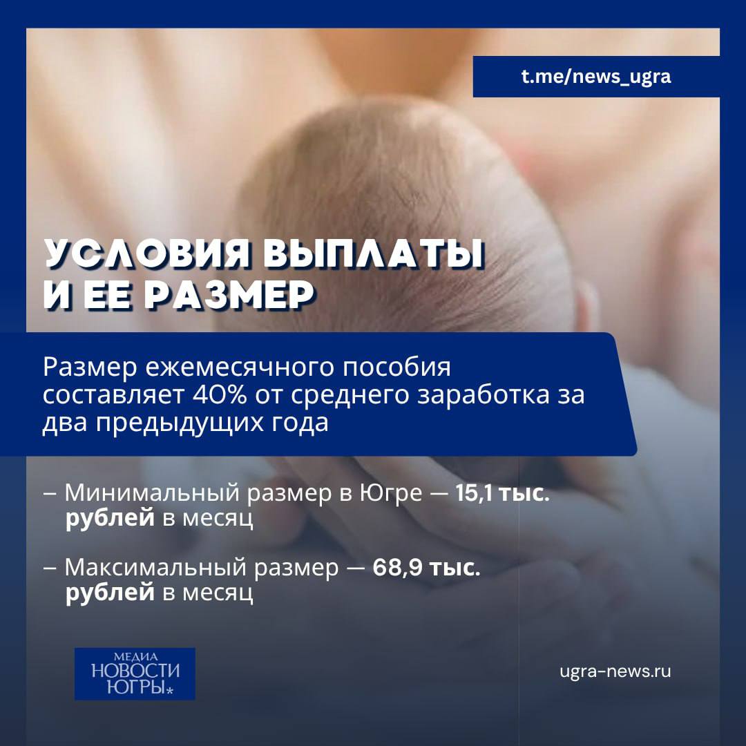 Размер ежемесячной выплаты составляет 40% среднего заработка, рассчитанного за два года, предшествующих отпуску по уходу за ребенком.
