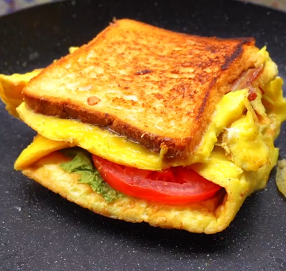 В завершение края бекона и яиц загибаются внутрь, формируя изумительный конверт, который затем складывается пополам. В итоге получается горячий и аппетитный сэндвич, из которого тянется расплавленный сыр.