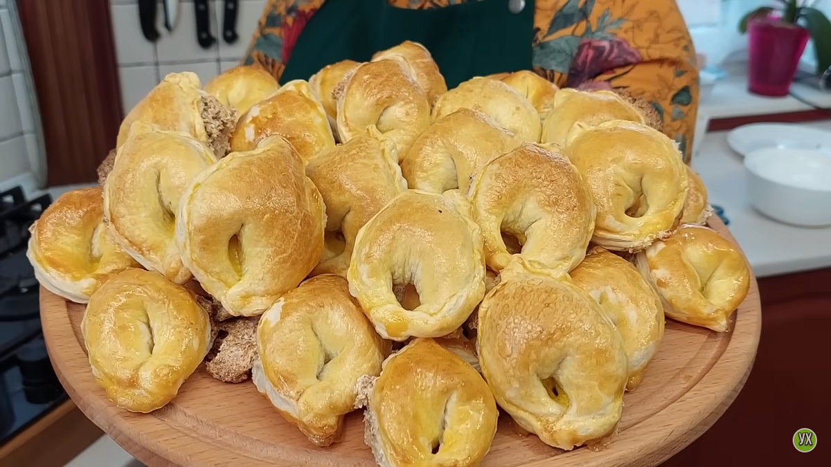Берём заранее размороженное слоёное тесто, раскатываем его и нарезаем на квадраты. На середину каждого квадрата кладём немного начинки, затем складываем тесто так, чтобы получить форму пельменя, слегка защипывая края. Оставляйте небольшие зазоры для того, чтобы печенье раскрылось во время выпекания.