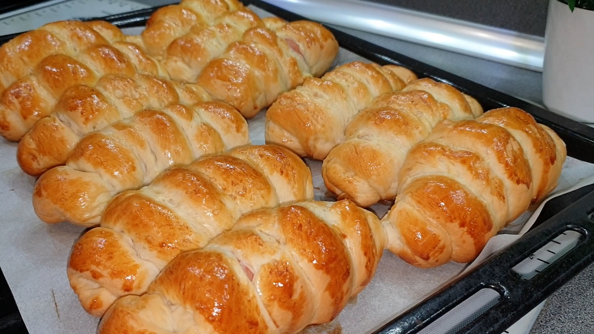 Каждый кусочек теста раскатайте в тонкий жгутик и оберните им сосиску. Получившиеся заготовки аккуратно расставьте на противень, выстланный пергаментом, и дайте постоять еще минут 15, чтобы они немного поднялись.