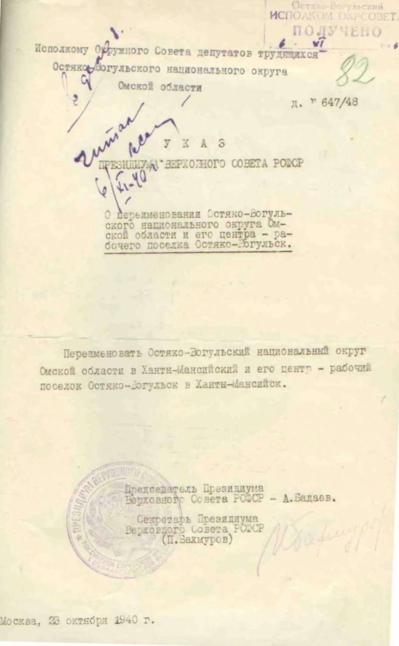 23 октября 1940 года, согласно указу Президиума Верховного Совета РСФСР, Остяко-Вогульский национальный округ был переименован в Ханты-Мансийский, а его центр, посёлок Остяко-Вогульск, получил имя Ханты-Мансийск.
