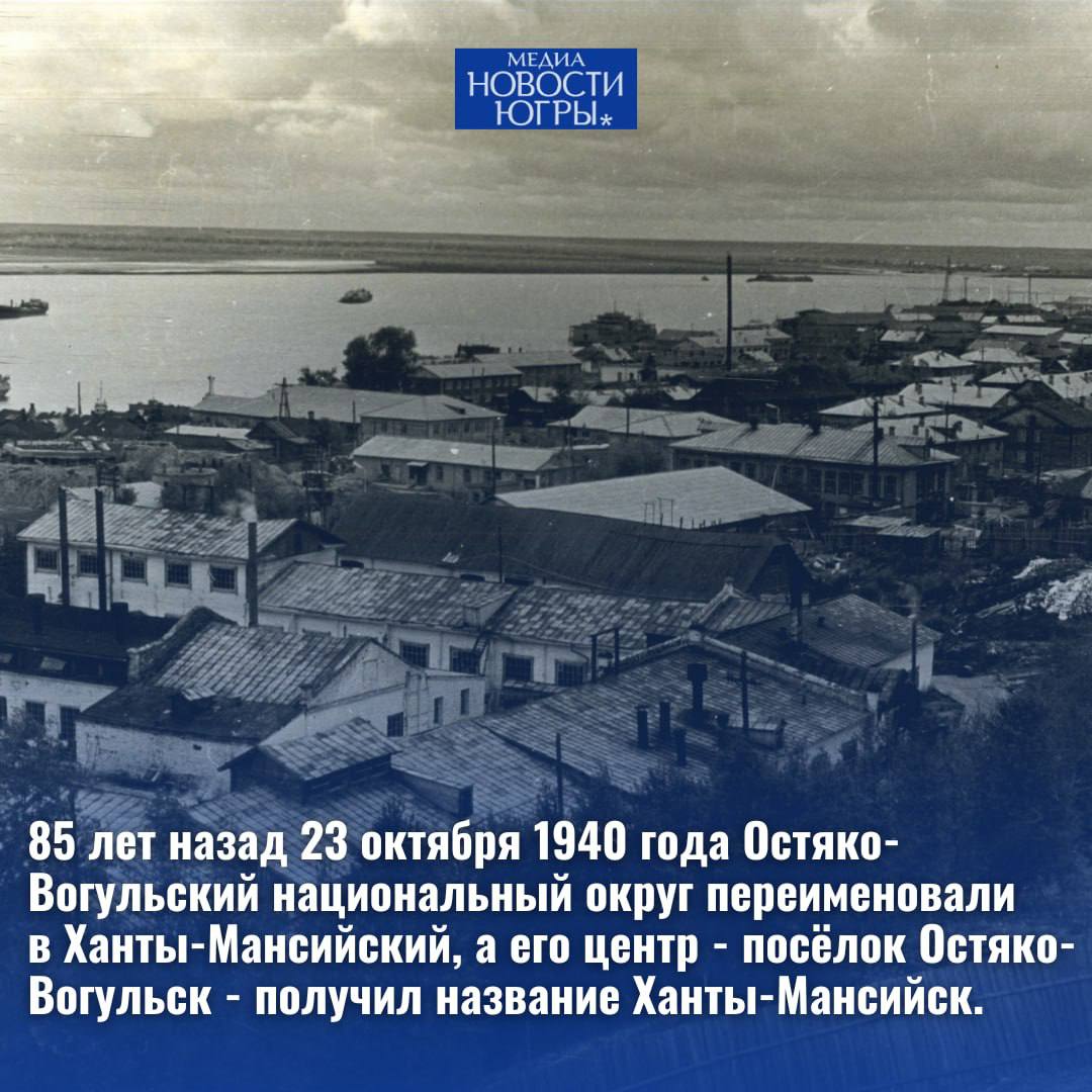 Ровно 85 лет назад, 23 октября 1940 года, Остяко-Вогульский национальный округ получил новое имя — Ханты-Мансийский, а его центр, посёлок Остяко-Вогульск, стал Ханты-Мансийском.