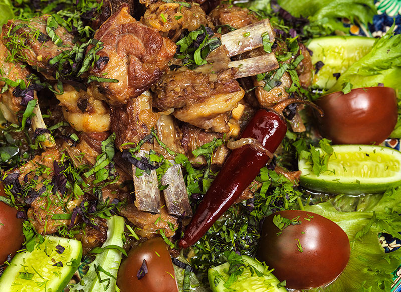 По истечении времени открываем казан и перемешиваем лук, проверяя на соль. Упакуйте вкусное мясо на блюде, и не забудьте про зелень! Блюдо лучше всего подавать с горячими лепешками. Рекомендуется отламывать кусочек лепешки, сворачивать мясо с луком и наслаждаться соусом, который останется на вашем блюде.