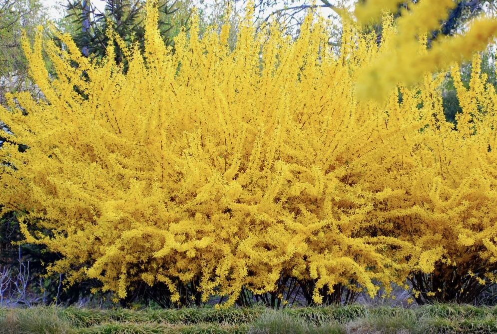 - Форзиция (Forsythia): Цветет с конца марта до апреля, щедро покрывая ветви яркими желтыми цветами. Растение морозостойкое и предпочитает солнечные места.