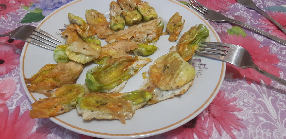 Для кляра яйца взбиваются с мукой, солью и перцем. Готовый фарш помещается в цветки, которые затем обмакиваются в кляр. Обжарьте их на сковороде с растительным маслом по 1,5–2 минуты с каждой стороны, до золотистой корочки.