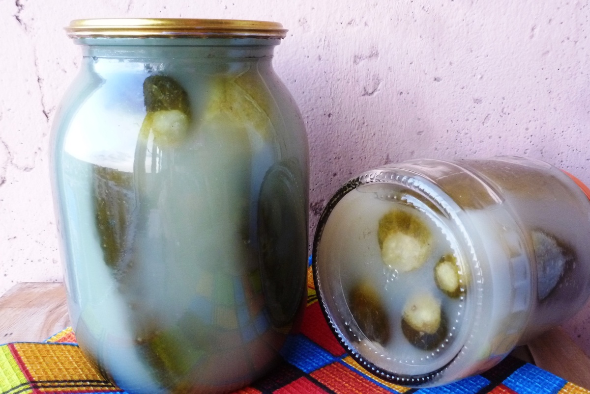 После завершения брожения, слейте рассол, уберите травы, а огурцы помойте и уложите в стерильную банку. Рассол прокипятите в течение 5 минут, не забывая снимать пену, а затем залейте кипящий рассол в банку с огурцами. Закройте крышкой и переверните ёмкость вверх дном. Укутайте банки и дайте им остыть.