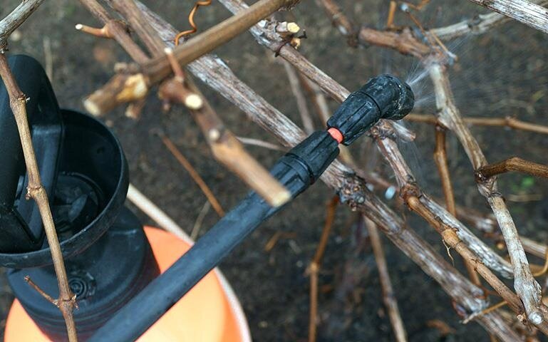 - Для равномерного распределения средств по лозе и почве необходимо использовать распылитель. Обычно на куст винограда среднего размера уходит 1-2 литра препарата, но точную дозировку уточняйте в инструкции.
