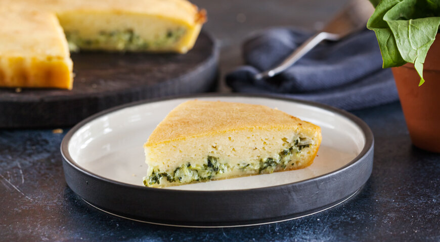 Выполните пирог, выложив немного теста на дно формы, затем на него — начинку из капусты с зеленью. Залейте остатками теста и выпекайте при температуре 180°C около одного часа. Дайте остыть и подавайте к столу!