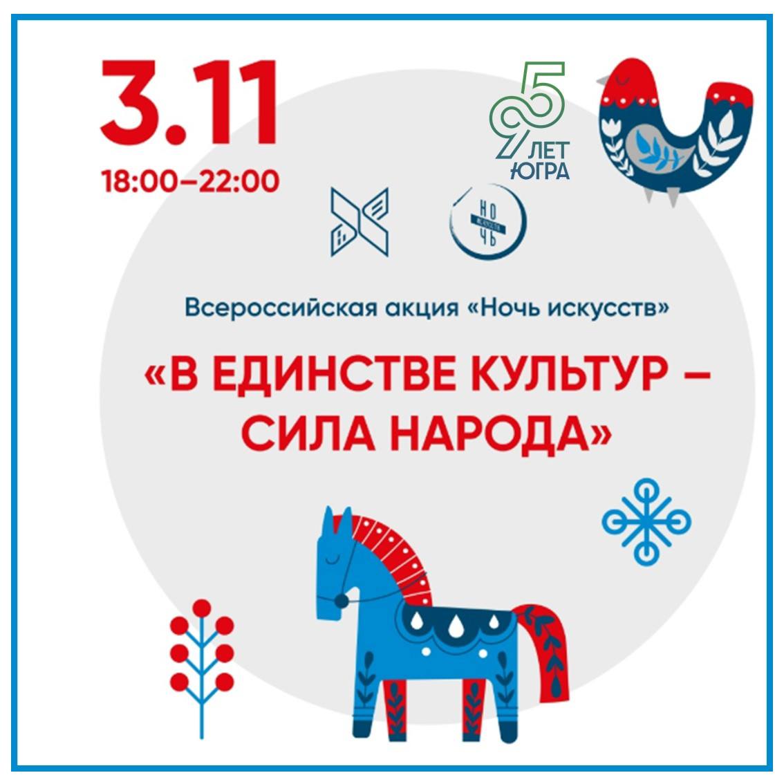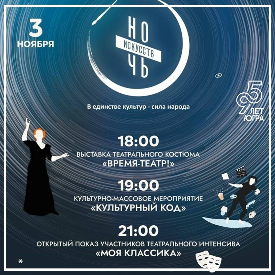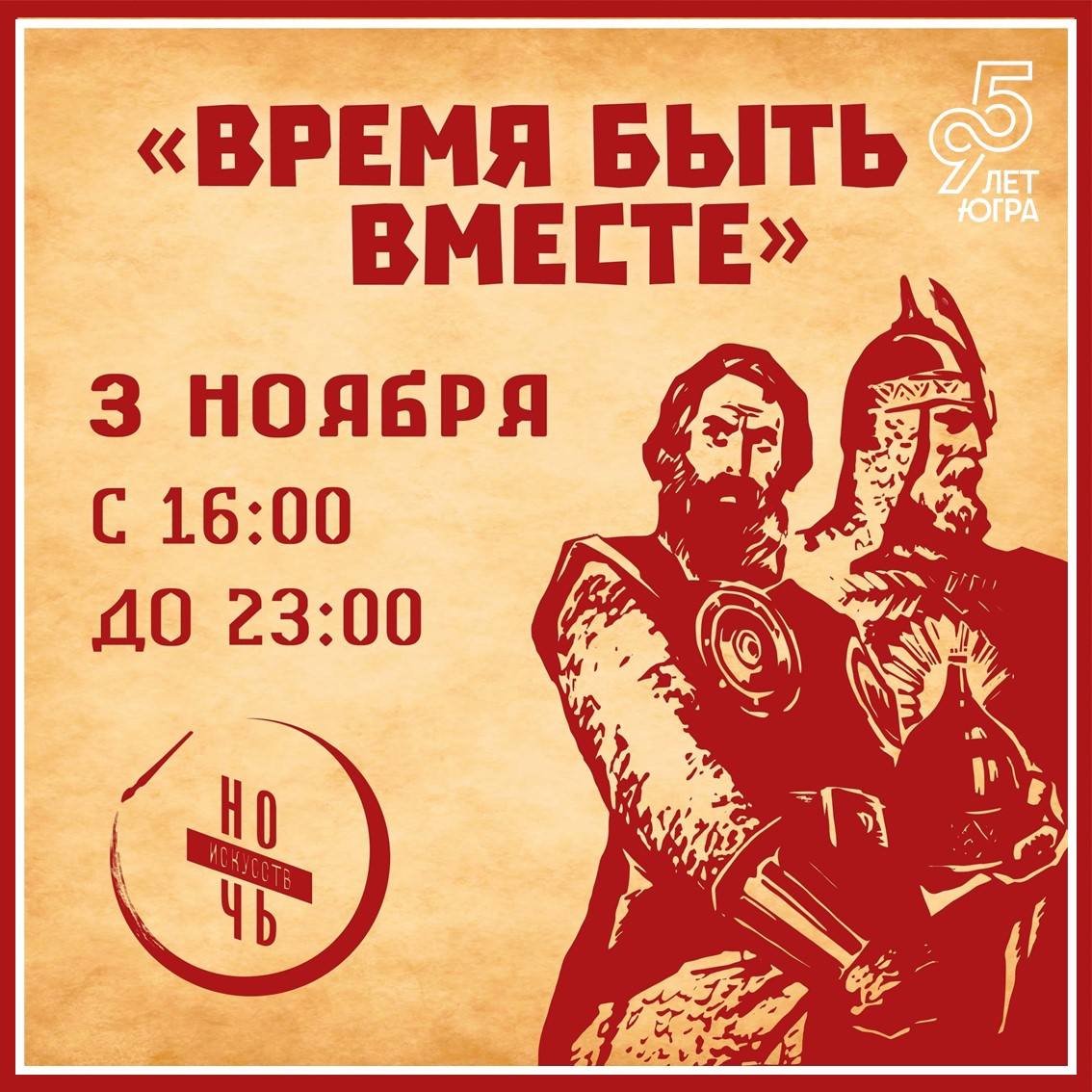 Жителей и гостей региона ждёт насыщенная программа — более 300 мероприятий по всей Югре. В этот вечер можно будет посетить выставки, мастер-классы, концерты, спектакли и кинопоказы, принять участие в интерактивных играх и хороводах, прогуляться по музейным экспозициям, поучаствовать в розыгрышах и уютных чаепитиях.
