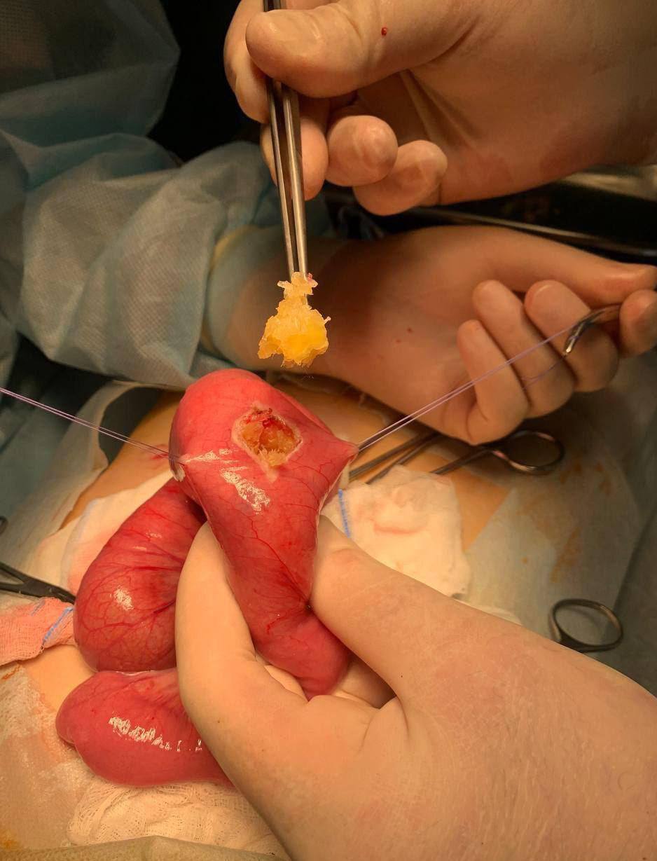 В ходе вмешательства из тонкой кишки извлекли примерно 300 г непереваренной пищи, блокировавшей просвет и нарушившей работу органа.