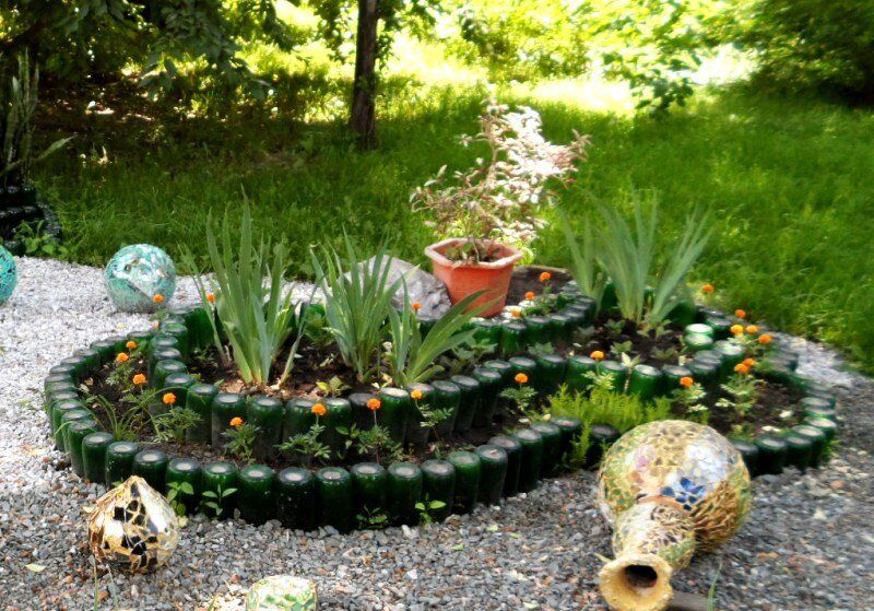 С наступлением весны и праздников на дачах и в домах неизменно накапливаются пустые бутылки из-под шампанского и вина. Вместо того чтобы выбрасывать эту стеклянную тару, её можно превратить в интересный декор для клумб. Особенно хорошо смотрятся бутылки темно-зеленого цвета — они прочные, не подвержены загрязнению и отлично гармонируют с растениями на участке.