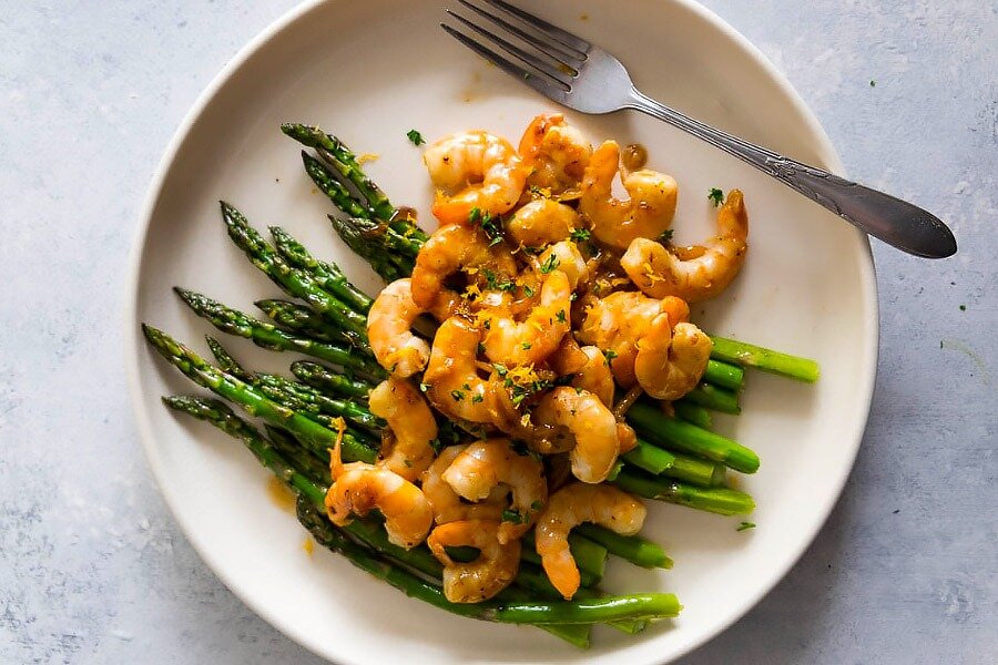 Перед началом приготовления спаржи стоит удалить жесткие концы стеблей: это обеспечит более приятный вкус готового блюда.На среднем огне раскалить столовую ложку растительного масла в сковороде. Добавить спаржу, приправить солью и перцем. Обжаривать ее, переворачивая, до образования золотистого оттенка. Спаржа должна оставаться хрустящей, поэтому важно не передержать её на огне. Затем переложить на сервировочную тарелку.В той же сковороде нагреть оставшуюся столовую ложку масла и добавить креветки. Обжаривать, поворачивая, пока они не станут почти готовыми, оставшись слегка прозрачными в центре — это займет около минуты. Затем выключить огонь и добавить апельсиновый соус, тщательно перемешивая. Выложить полученную смесь на спаржу и подать к столу.Подача и изысканный вкус