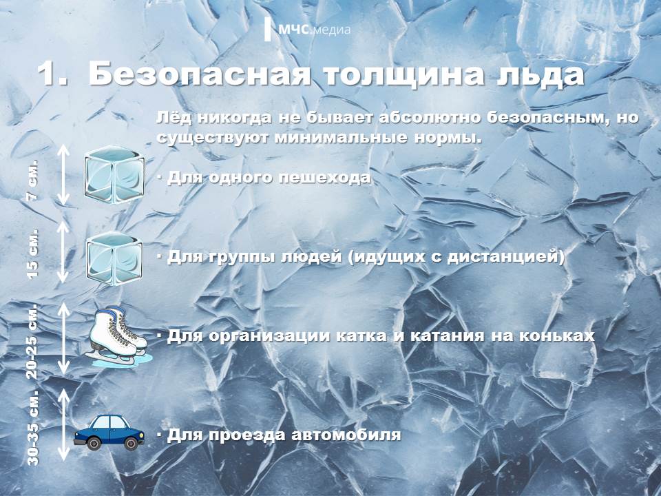 Минимальная толщина льда для безопасного пребывания на водоёме одного человека должна составлять не менее 7 см.