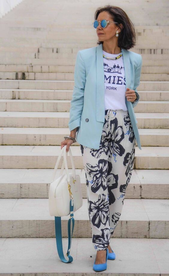 - Легкие и яркие вещи: Стильный образ можно создать, сочетая светлые брюки с цветочным принтом, легкую футболку и жакет нежно-голубого оттенка. Такой комплект прекрасно дополнит обувь на невысоком каблуке в том же цвете, аккуратные украшения и классические очки.