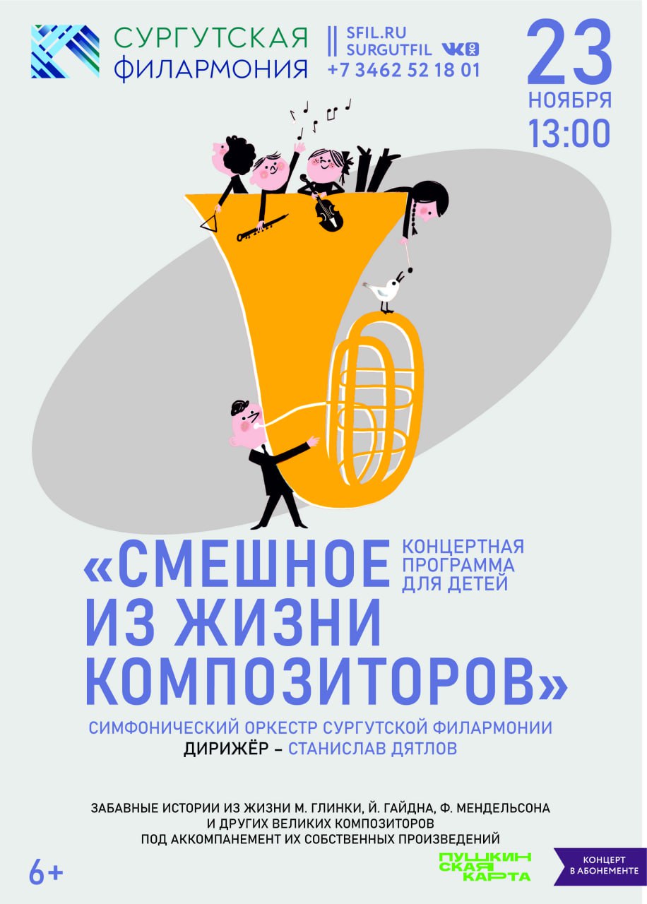 Сургутская филармония приглашает на концертную программу для детей «Смешное из жизни композиторов». Гостей ждёт увлекательный концерт, где можно узнать много нового о композиторах и, конечно, великолепная музыка, которая подарит отличное настроение.