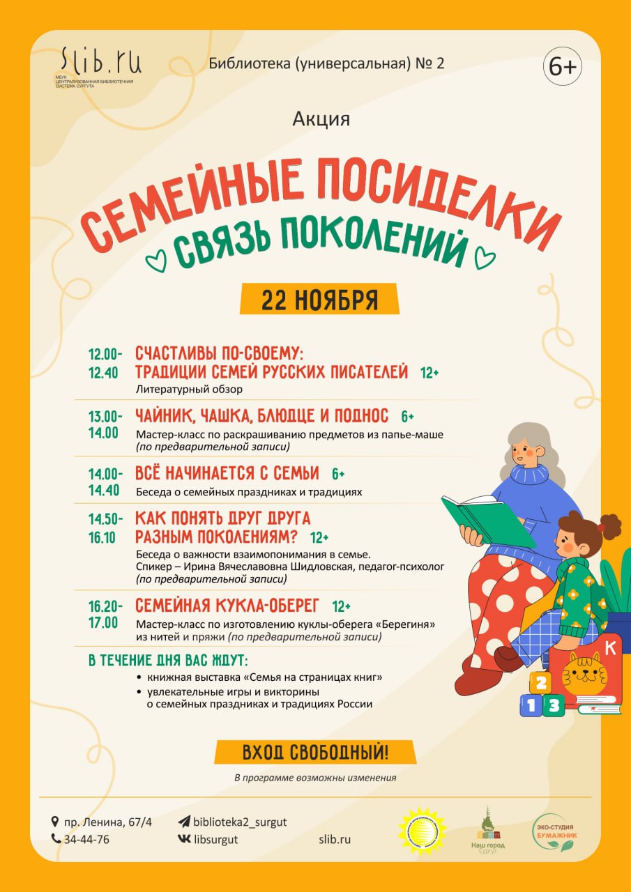 В 12:00 универсальная библиотека № 2 приглашает на цикл мероприятий «Семейные посиделки. Связь поколений», посвящённых семейным традициям. Это совместное творчество членов семьи разных поколений. В программе – мастер-классы, книжные обзоры и беседы о самом главном.