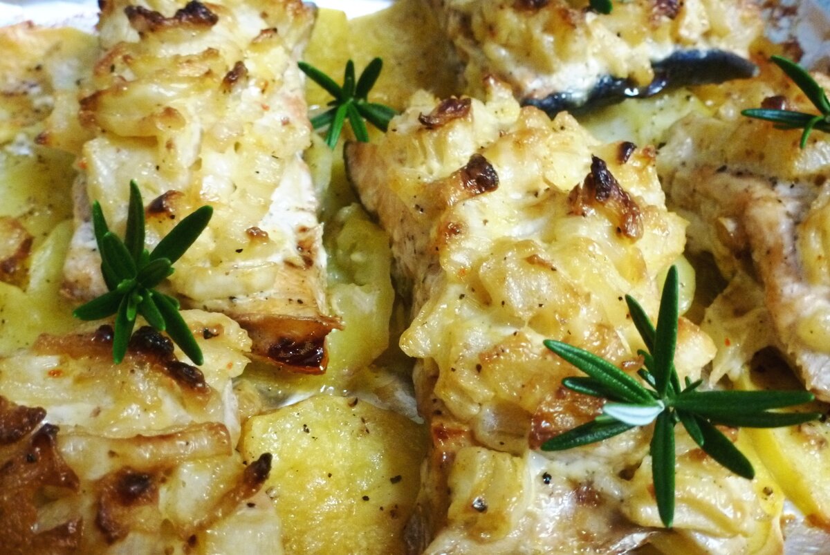 Теперь картофель следует очистить и нарезать тонкими кружками. Противень рекомендуется застелить фольгой и смазать растительным маслом, чтобы избежать прилипания. На дно противня аккуратно раскладываются кружочки картофеля, которые необходимо приправить солью и перцем. Затем на каждый кусочек картошки выкладываются порции горбуши, сверху – щедрые порции луковой массы.